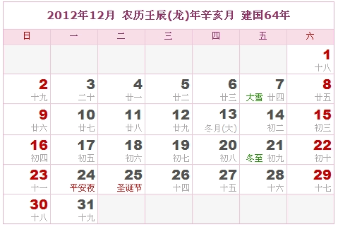 2012年12月 农历壬辰(龙)年辛亥月 建国64年