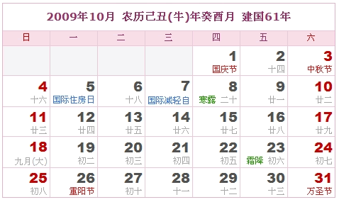 2009年10月 农历己丑(牛)年癸酉月 建国61年
