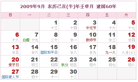 2009年9月 农历己丑(牛)年壬申月 建国60年