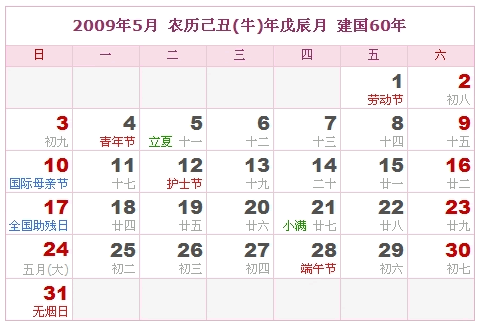 2009年5月 农历己丑(牛)年戊辰月 建国60年