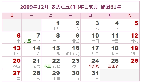 2009年12月 农历己丑(牛)年乙亥月 建国61年