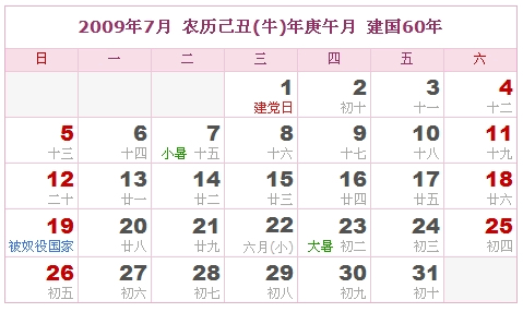 2009年7月 农历己丑(牛)年庚午月 建国60年