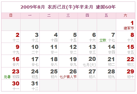 2009年8月 农历己丑(牛)年辛未月 建国60年