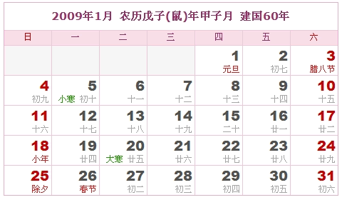 2009年1月 农历戊子(鼠)年甲子月 建国60年