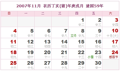 2007年11月 农历丁亥(猪)年庚戌月 建国59年