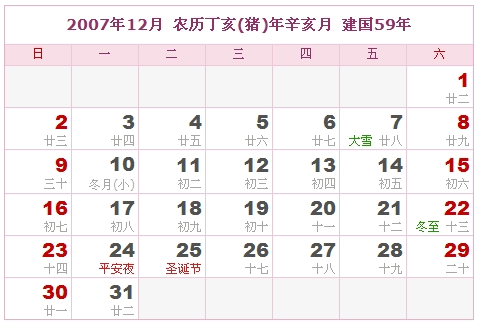2007年12月 农历丁亥(猪)年辛亥月 建国59年