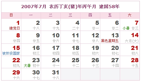 2007年7月 农历丁亥(猪)年丙午月 建国58年