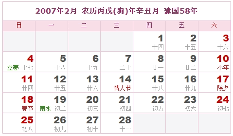 2007年2月 农历丙戌(狗)年辛丑月 建国58年