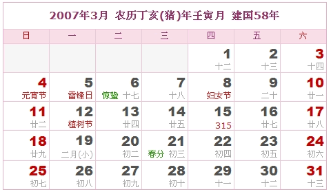 2007年3月 农历丁亥(猪)年壬寅月 建国58年