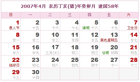 2007年4月 农历丁亥(猪)年癸卯月 建国58年