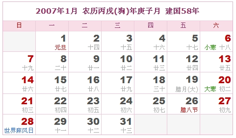 2007年1月 农历丙戌(狗)年庚子月 建国58年