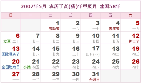 2007年5月 农历丁亥(猪)年甲辰月 建国58年