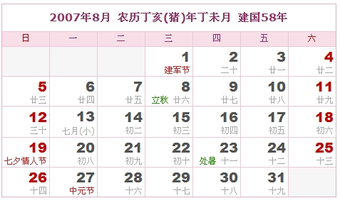2007年8月 农历丁亥(猪)年丁未月 建国58年