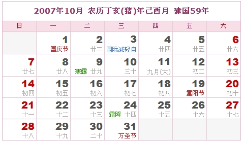 2007年10月 农历丁亥(猪)年己酉月 建国59年