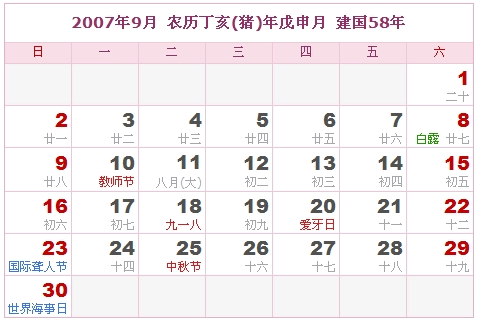 2007年9月 农历丁亥(猪)年戊申月 建国58年