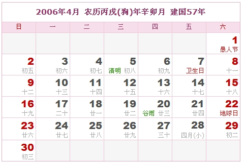 2006年4月 农历丙戌(狗)年辛卯月 建国57年