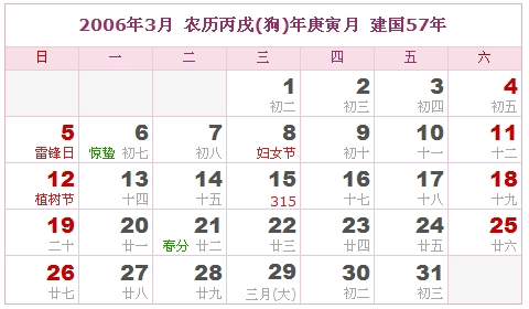 2006年3月 农历丙戌(狗)年庚寅月 建国57年