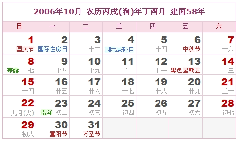 2006年10月 农历丙戌(狗)年丁酉月 建国58年