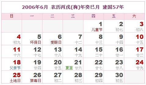 2006年6月 农历丙戌(狗)年癸巳月 建国57年