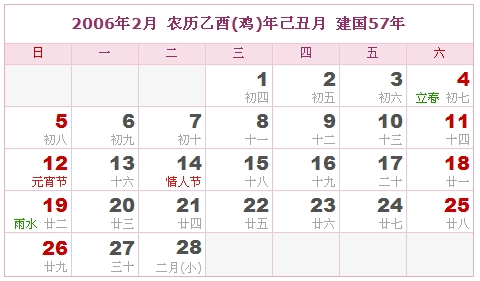 2006年2月 农历乙酉(鸡)年己丑月 建国57年