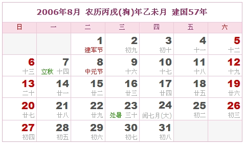 2006年8月 农历丙戌(狗)年乙未月 建国57年