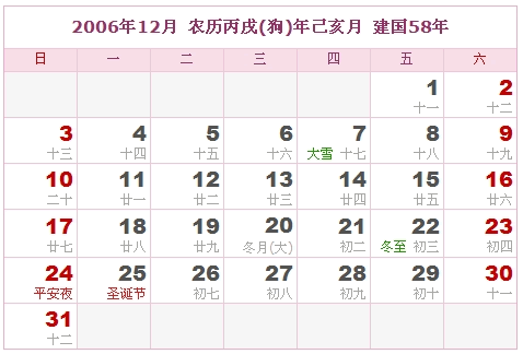 2006年12月 农历丙戌(狗)年己亥月 建国58年