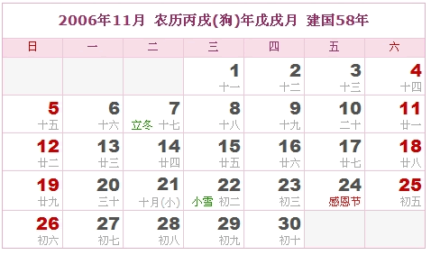 2006年11月 农历丙戌(狗)年戊戌月 建国58年