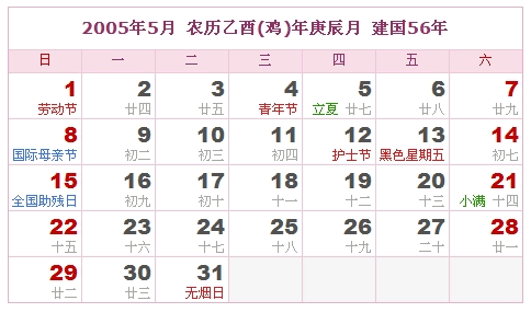 2005年5月 农历乙酉(鸡)年庚辰月 建国56年