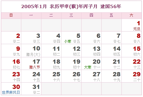 2005年1月 农历甲申(猴)年丙子月 建国56年