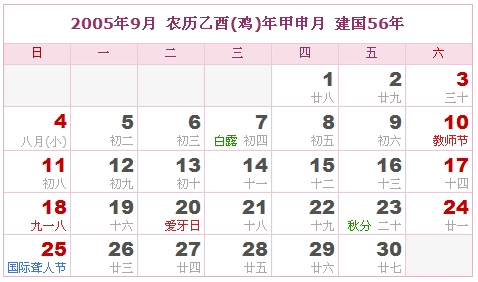 2005年9月 农历乙酉(鸡)年甲申月 建国56年