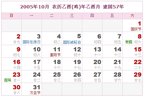 2005年10月 农历乙酉(鸡)年乙酉月 建国57年