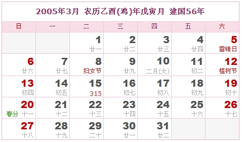 2005年3月 农历乙酉(鸡)年戊寅月 建国56年