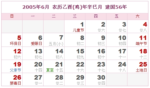 2005年6月 农历乙酉(鸡)年辛巳月 建国56年