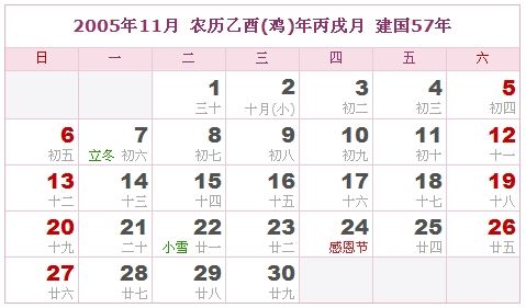 2005年11月 农历乙酉(鸡)年丙戌月 建国57年