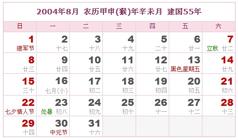 2004年8月 农历甲申(猴)年辛未月 建国55年