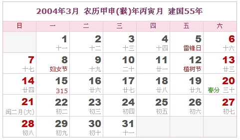 2004年3月 农历甲申(猴)年丙寅月 建国55年