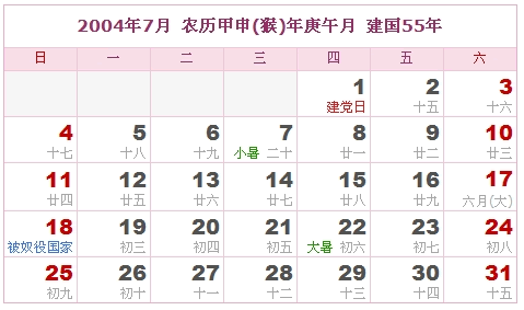 2004年7月 农历甲申(猴)年庚午月 建国55年