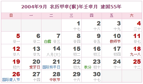 2004年9月 农历甲申(猴)年壬申月 建国55年