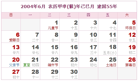 2004年6月 农历甲申(猴)年己巳月 建国55年