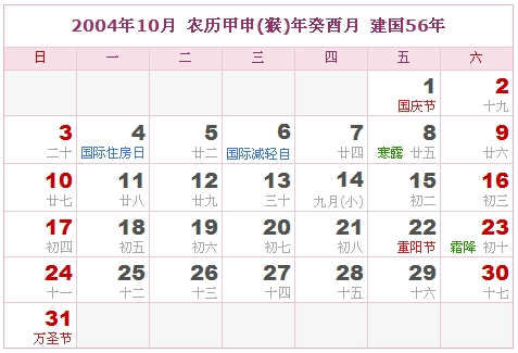 2004年10月 农历甲申(猴)年癸酉月 建国56年