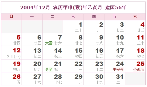 2004年12月 农历甲申(猴)年乙亥月 建国56年