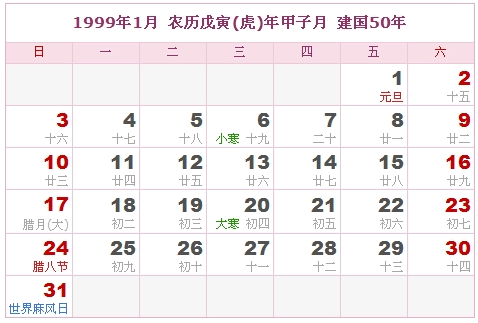 1999年1月 农历戊寅(虎)年甲子月 建国50年