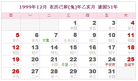 1999年12月 农历己卯(兔)年乙亥月 建国51年