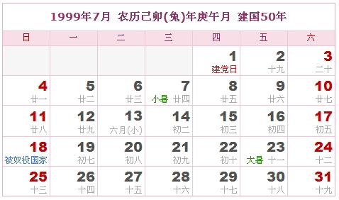 1999年7月 农历己卯(兔)年庚午月 建国50年