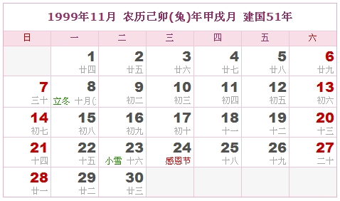 1999年11月 农历己卯(兔)年甲戌月 建国51年
