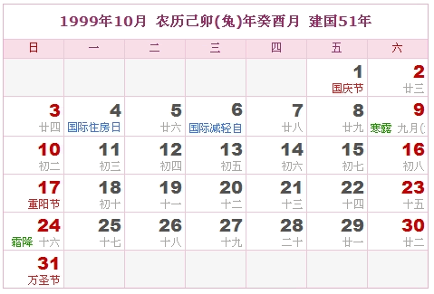 1999年10月 农历己卯(兔)年癸酉月 建国51年