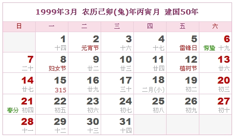 1999年3月 农历己卯(兔)年丙寅月 建国50年