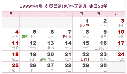 1999年4月 农历己卯(兔)年丁卯月 建国50年