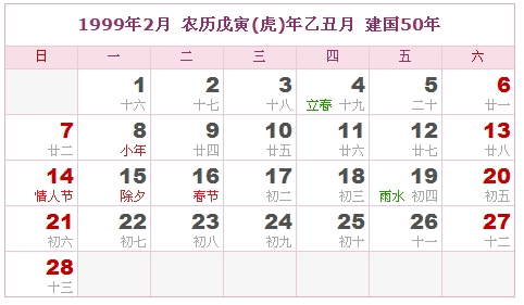 1999年2月 农历戊寅(虎)年乙丑月 建国50年