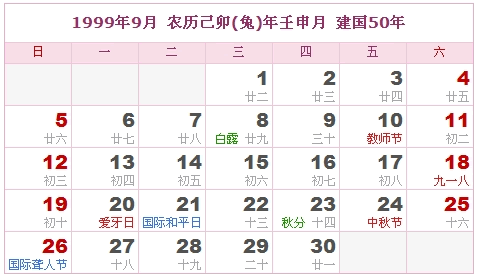 1999年9月 农历己卯(兔)年壬申月 建国50年